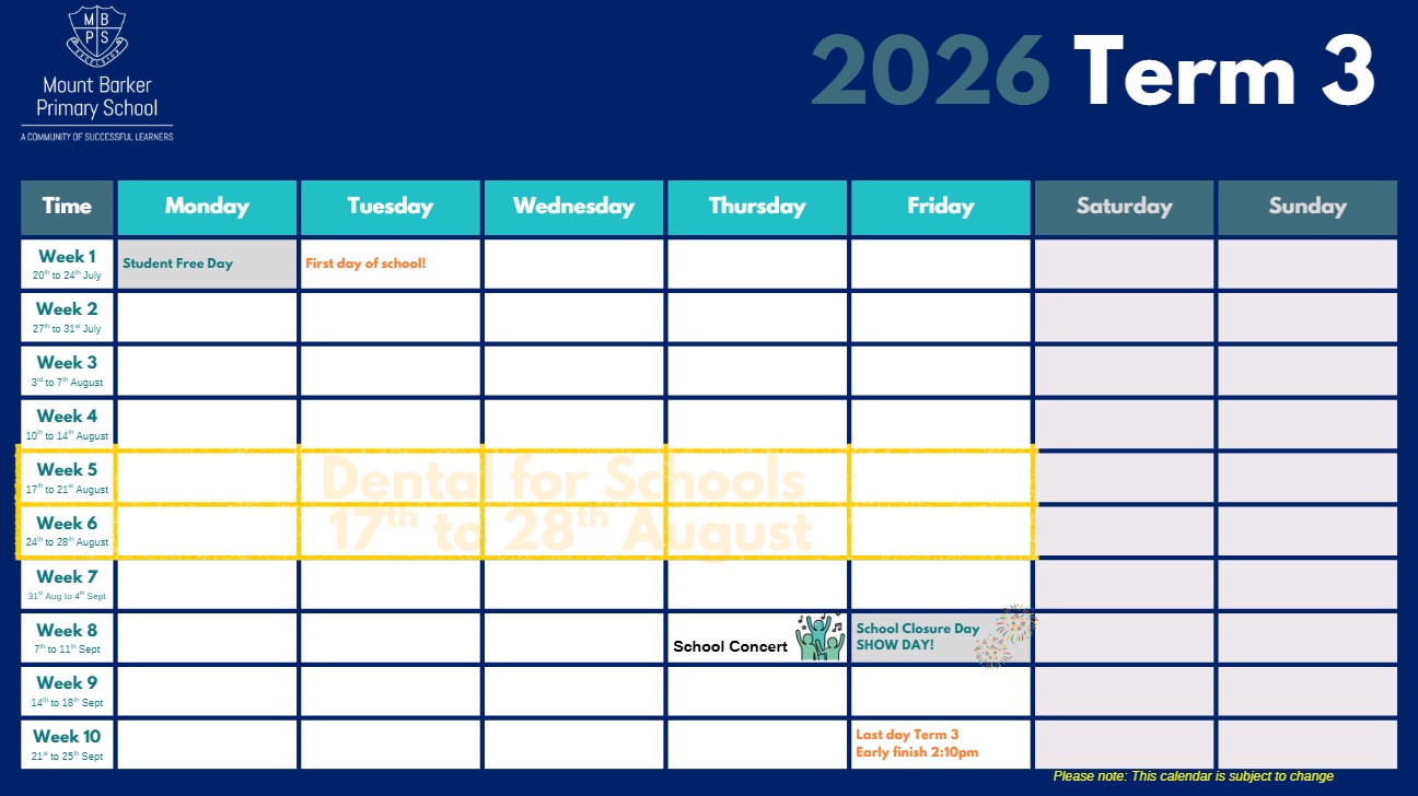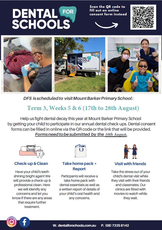 | Dental For Schools Visit | Mon 17 Aug 2026 | Something to make our smiles even brighter! In Weeks 5&6, Term 3 we have DENTAL FOR SCHOOLS coming to Mount Barker Primary School! This is covered by Medicare, so it's no out-of-pocket expense. They will provide a check-up & professional clean. They will identify any concerns and let you know if there are any areas that require further treatment. You will need to complete the forms that will be sent home this week with your children. This form is also available online, on the Dental for Schools website. Please complete the forms and ask your child to return it to their teacher. If you do not wish your child to participate, please advise your student's teacher via Seesaw or email. If you would like more information visit www.dentalforschools.com.au |