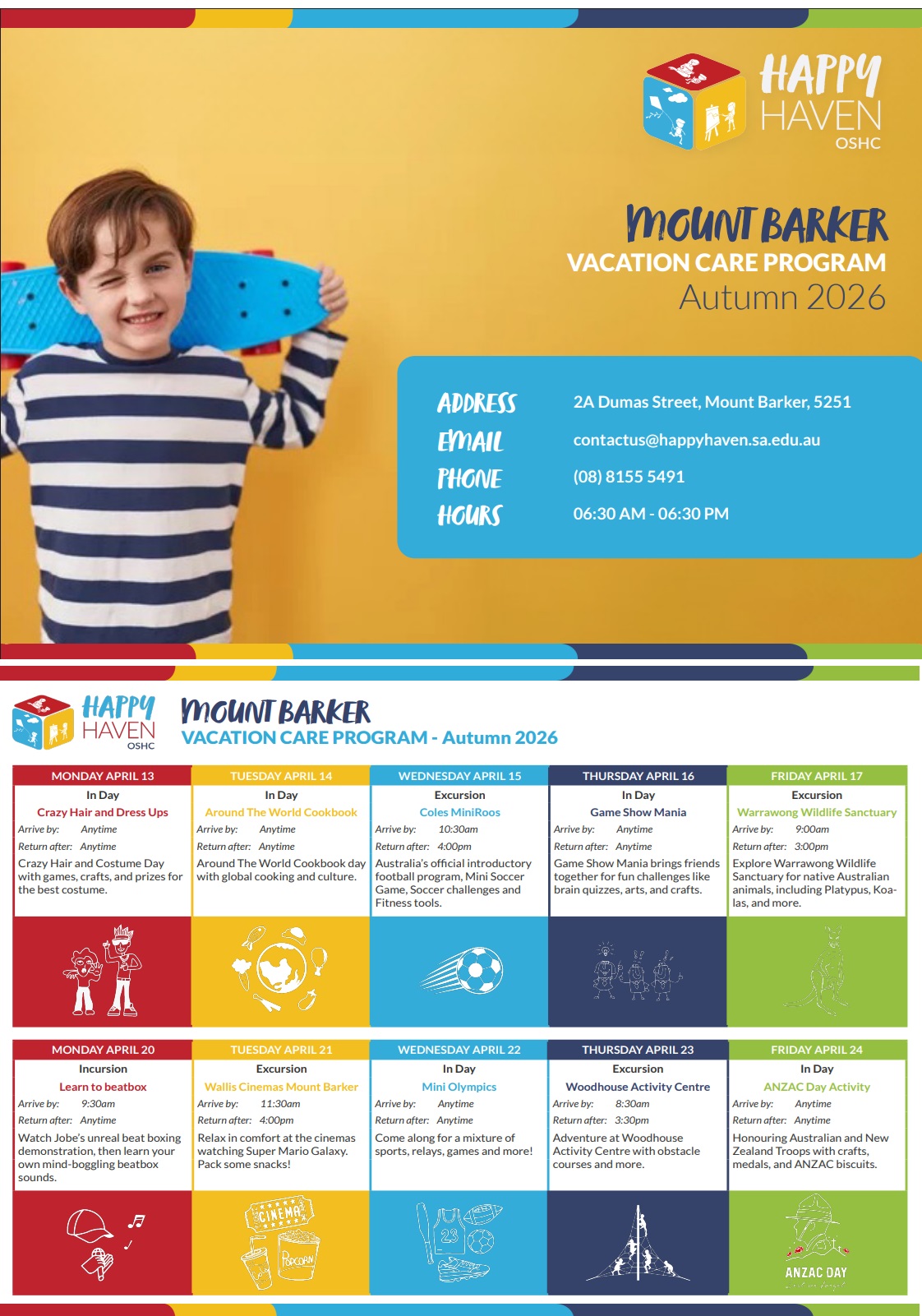 | Happy Haven School Holidays Term 1 | Sun 12 Apr 2026 | School Holiday Program Term 1 Holidays. | |
