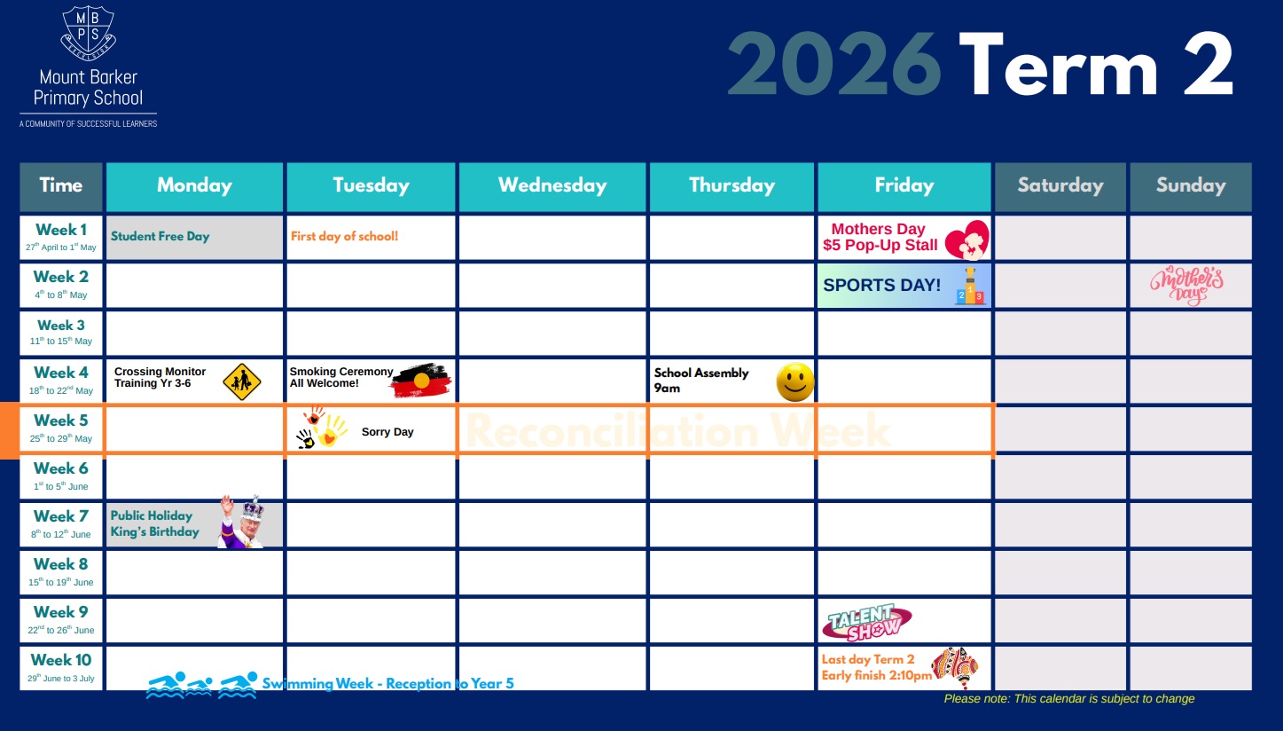 | Smoking Ceremony - All Welcome! | Tue 19 May 2026 | Smoking Ceremony for Sorry Day, all families welcome to join this special assembly | |