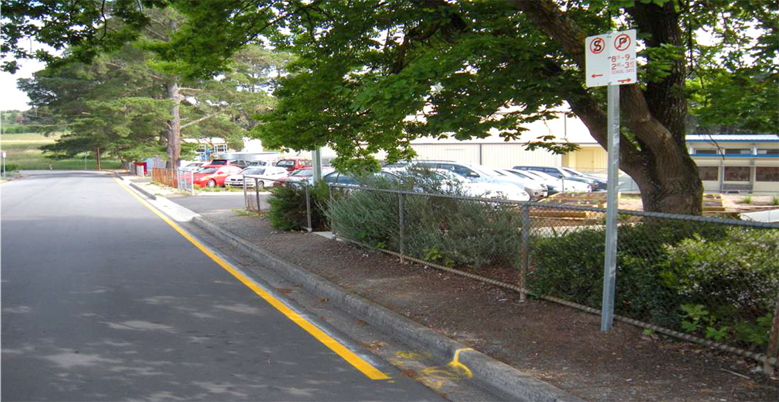 The solid yellow line in front of the Staff Car Park (pictured here) means cars are not permitted to stop where there is a solid yellow line. Please do not drive through or park in the staff car park at any time.